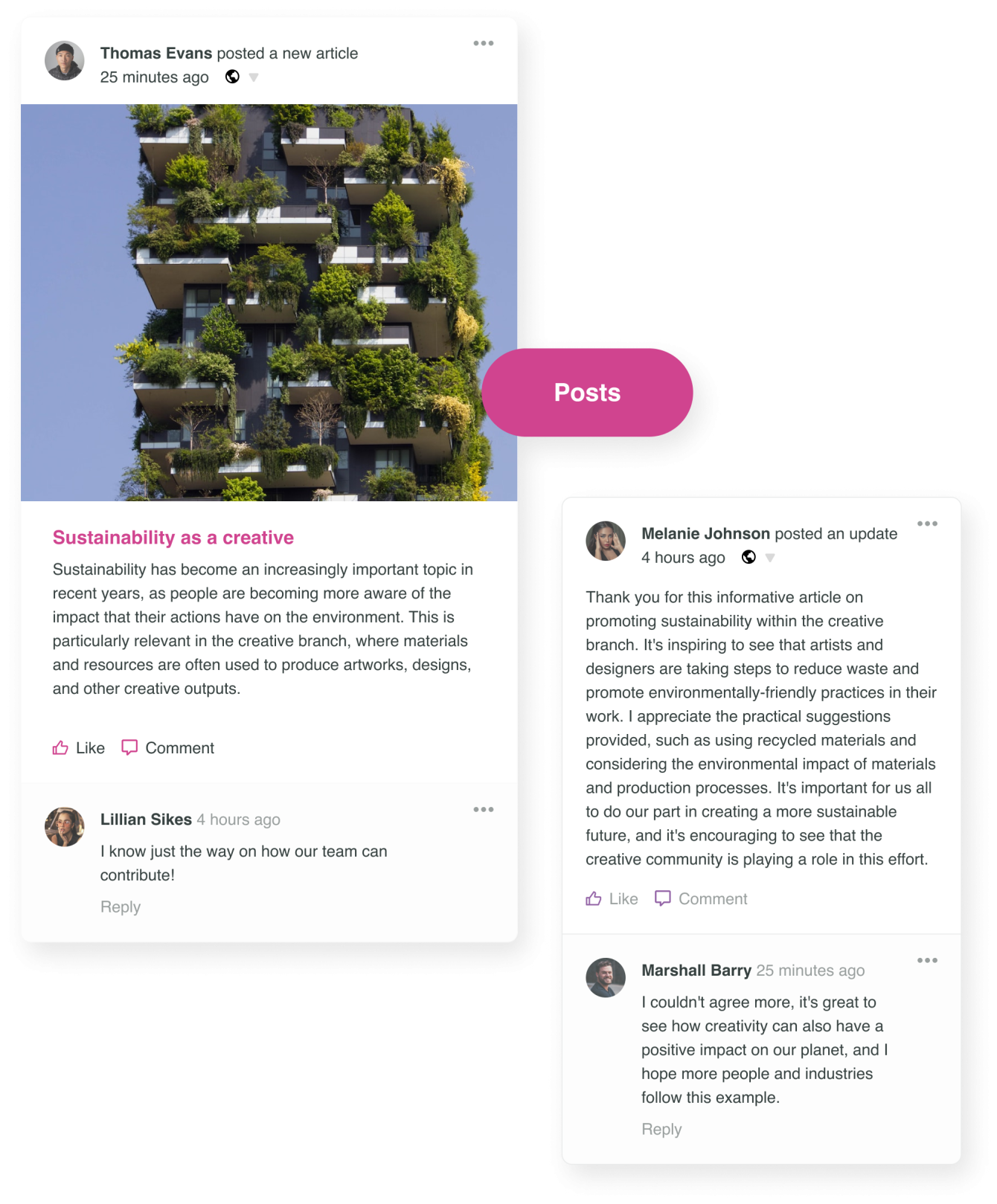 - Organisatie updates kunt plaatsen waarover je met je collega’s online het gesprek kunt aangaan.
